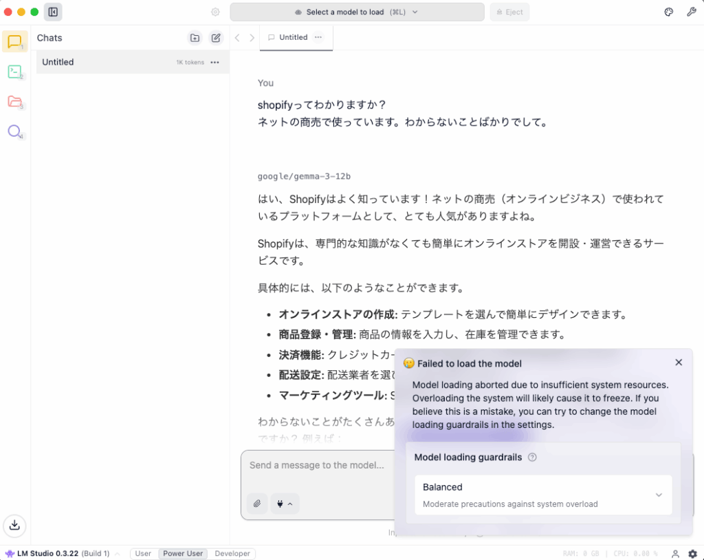 システムリソース不足のため、モデルの読み込みが中止されました。システムに過負荷をかけると、フリーズする可能性があります。これが誤りであると思われる場合は、設定でモデル読み込みのガードレールを変更してみてください。