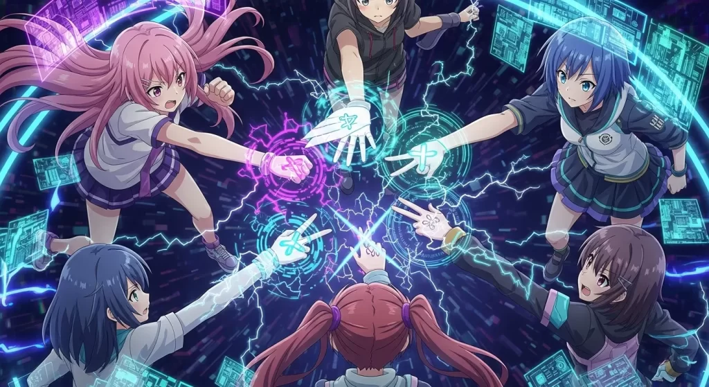 この記事にピッタリなイラストのための考えたリクエストは、「サイバー空間でグーチョキパーのじゃんけんゲーム。突き出された手を上からの構図で、白熱の状況。全員女性で日本のアニメ風。」です。
