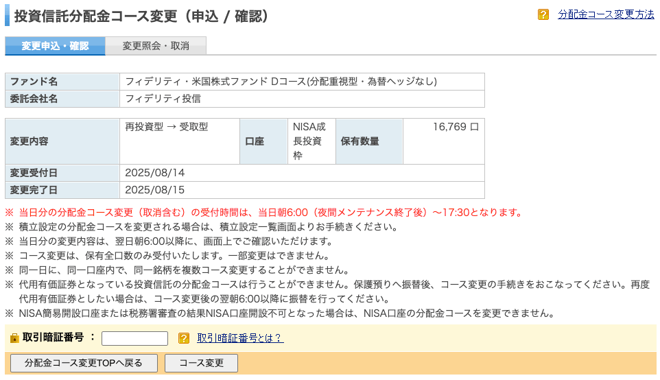 楽天証券の新機能、分配金コース変更を行いました。その記録です。
